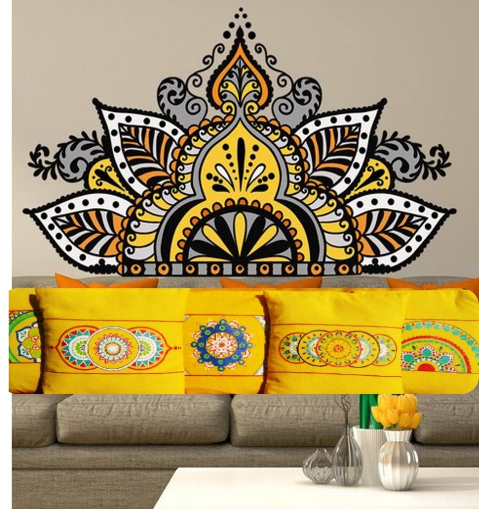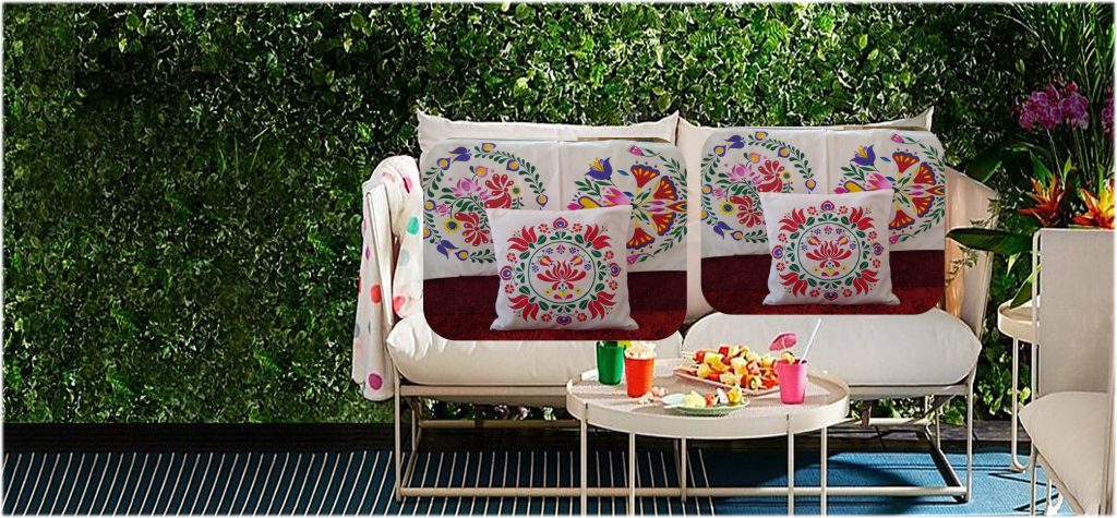 It occupies an important space in the country’s culture: colorful embroidery, pottery, lace produced by local craftsmen. Inspired by its hues and intricate motifs the designer has painted the magic on the cushion cover. The combination of Dark Blue and White was associated with calmness and usefulness. Medium green was a sign of spring, hopefulness, and renewal in folk art. Yellow was the color of the burning sun, which brings transience